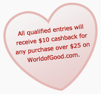 The deadline to enter is 11:59 p.m. PST on Sunday, February 7, 2010. Winners will be contacted by email on Monday, February 8, 2010. Winners must reply to WorldofGood.com with prize recipient’s name and address no later than 6 p.m. PST Tuesday, February 9, 2010 to ensure on-time prize delivery. Prizes will only be mailed to valid U.S. addresses. Your submission becomes the property of WorldofGood.com and we may republish it in part or entirety. The winners will be picked by WorldofGood.com staff based on variety of factors including, but not limited to, originality, humor, sincerity and/or desperation. All qualified entries will receive an email with a link to the $10 cashback promotion (on any WorldofGood.com purchase of $25 or more) on February 12, 2010. If you have used a WorldofGood.com cashback promotion in the past six months you will not be eligible for this cashback offer.