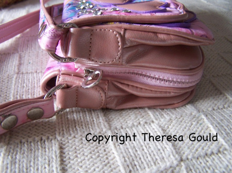 As you can see in the picture the Victorian Pink is pink with pink flowers trimmed with purple. It has silver rhinestones and a pink/purple/tourquoise paisley background. It opens via a magnetic clasp, which is a very easy clasp for even very young girls.