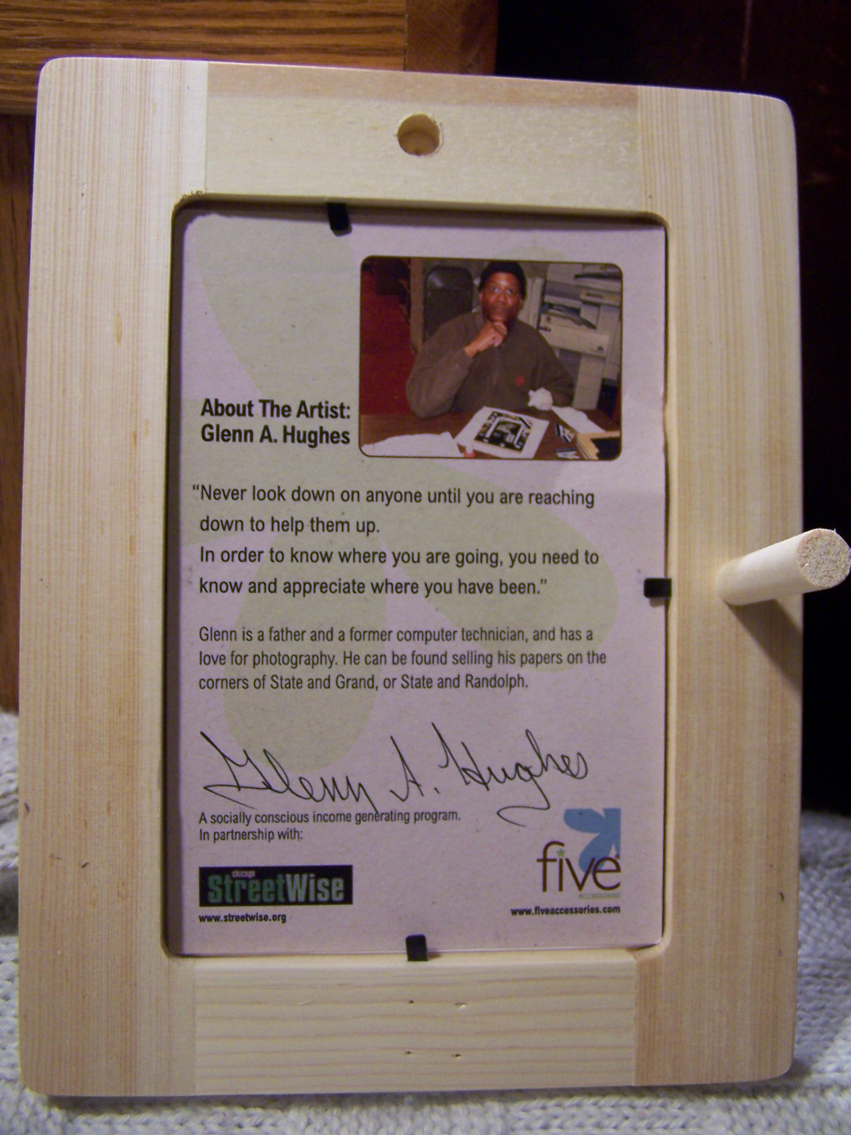 The insert of the frame has not only five’s logo, but a photo of Glenn and a little bio about him. It gives the product a personal touch and truly makes one want to support a socially conscious business like five ACCESSORIES because of all the good they are doing in a world that is hurting during this economic downturn.