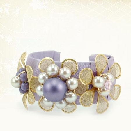 This is a beautiful lavender Dupioni Silk Cuff with mesh flowers and matte Czech glass pearl centers.