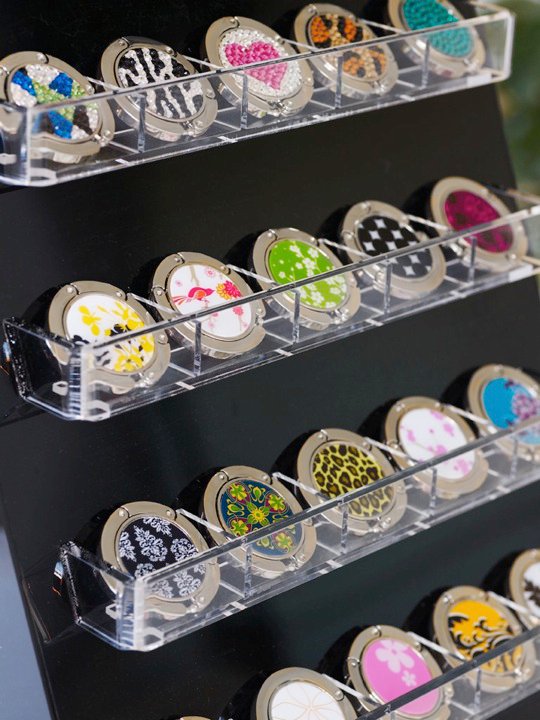 The exclusive Luxe Link(TM) handbag holder is also environmentally friendly and made only with recycled materials. No larger than the size of poker chip, Luxe Link(TM purse holders are portable, light, and easy-peasy to use. Instead of a cumbersome traditional purse hook, the Luxe Link(TM) purse hook has a stylish chain that wraps around a swanky circular top, adorned with a modern, playful design and Luxe Links also converts into a stylish purse charmby using it’s unique clasp like feature that allows you to attach your Luxe Link to the strap of your bag. Never again will you have to dig into the big abyss to find it.