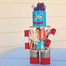 * A Patri-botic Centerpiece: Do U need a GR8 helper 4 yours picnic on the 4th? Well, this is one can-do robot. His recycled-can head holds a hair-raising array of utensils, and a clear container belly keeps cookies safe from eager little hands until it’s time for dessert.
