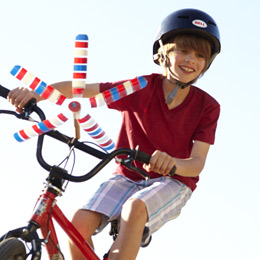 * Spirited Bike Spinner: Old Glory won’t be the only thing blowing in the breeze this Fourth. Made from a strategically snipped and bent plastic bottle wrapped in tape, this colorful bike accessory twirls in the air as your kids pedal.